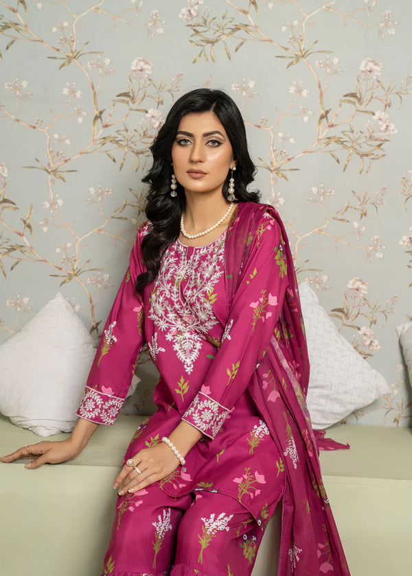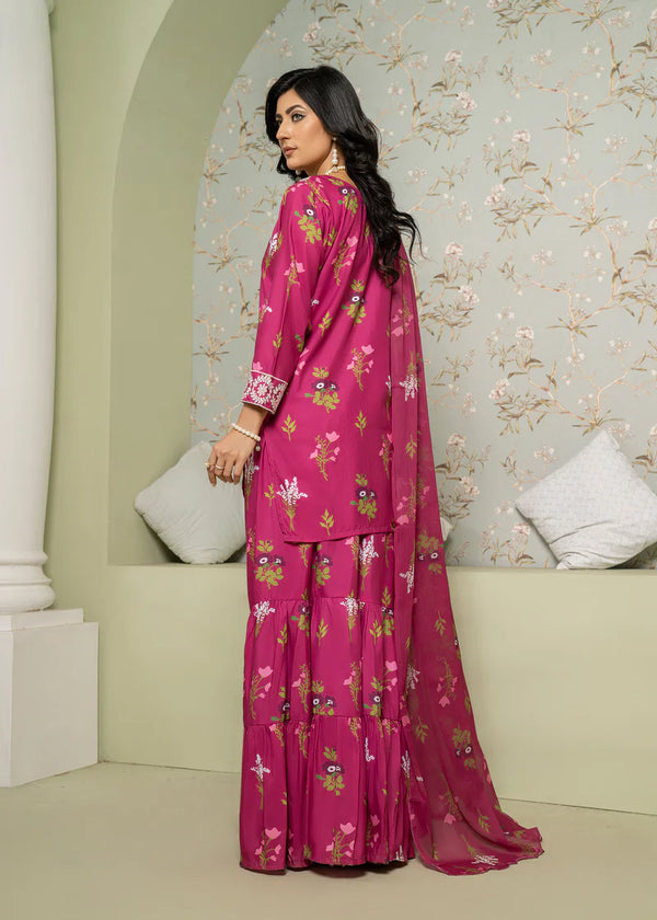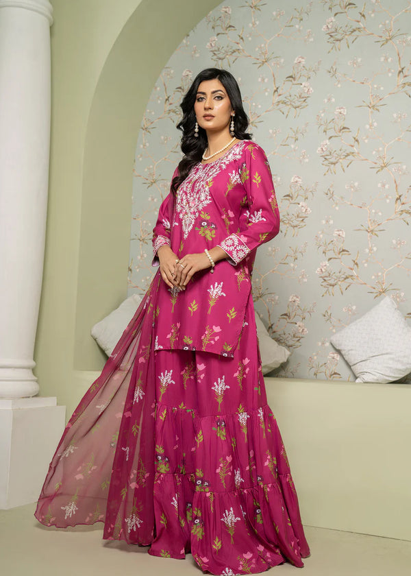 Armeena 2Pc is a stunning pink gharara set crafted from premium lawn fabric. It features intricate hand embroidery on the kameez, perfectly paired with a flowy gharara. This elegant, lightweight ensemble ensures all-day comfort while blending traditional style with contemporary sophistication.