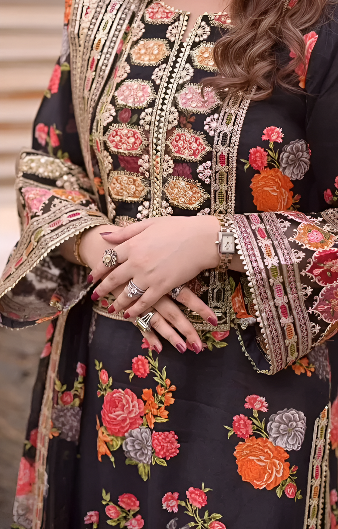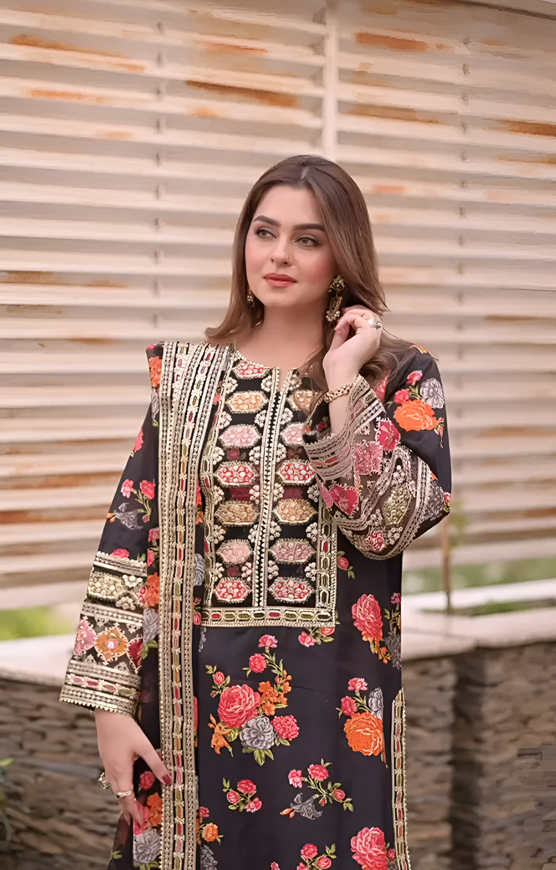 Embellished Dupatta: A digital printed chiffon dupatta (scarf) is included, featuring a sequence embroidered pallu on all four sides.